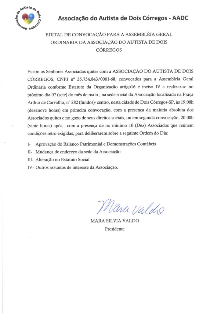 EDITAL DE CONVOCAÇÃO PARA A ASSEMBLÉIA GERAL ORDINARIA DA ASSOCIAÇÃO DO AUTISTA DE COIS CÓRREGOS